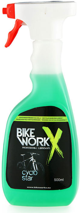 Univerzální čistidlo Bikeworkx GREENER CLEANER. Díky extra husté pěně odstraní z celého kola rychle a šetrně veškeré nečistoty. Lze jej použít i pro karbonové rámy.